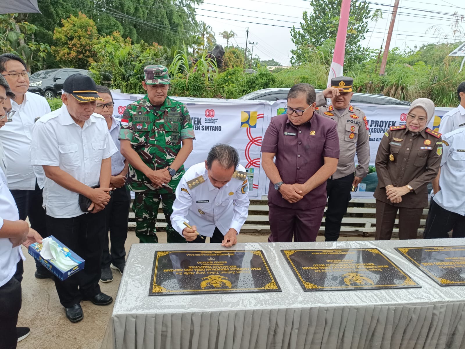 SINTANG – Bupati Sintang, Gregorius Herkulanus Bala, meresmikan 10 proyek pembangunan yang dibiayai melalui anggaran tahun 2024 dan 2025. Peresmian ditandai dengan penandatanganan prasasti dan pengguntingan pita yang berlangsung di Halaman Sekretariat Ikatan Bidan Indonesia (IBI) Kabupaten Sintang, Rabu 20 Agustus 2025.