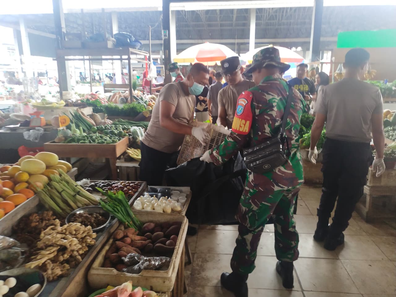Dengan penuh semangat kebersamaan, para personel memunguti sampah, membersihkan saluran air, serta merapikan lingkungan pasar yang menjadi pusat aktivitas masyarakat tersebut. Sampah-sampah yang berserakan di sejumlah titik dikumpulkan untuk menciptakan suasana pasar yang lebih bersih dan nyaman.