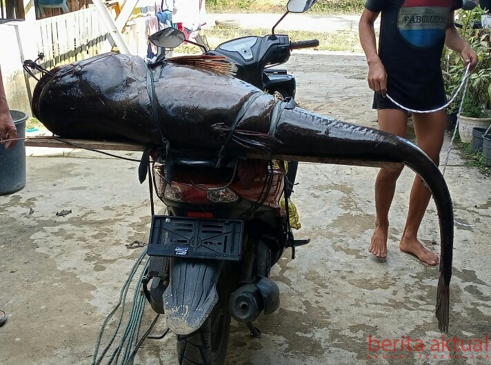 Saking beranya Ikan tapah yang didapat Endi, perlu dua orang mengangkatnya dari perahu ke daratan. Bahkan, panjangnya nyaris seukuran manusia dewasa. Setelah ditimbang, ikan tapah itu beratnya 55 kilogram.