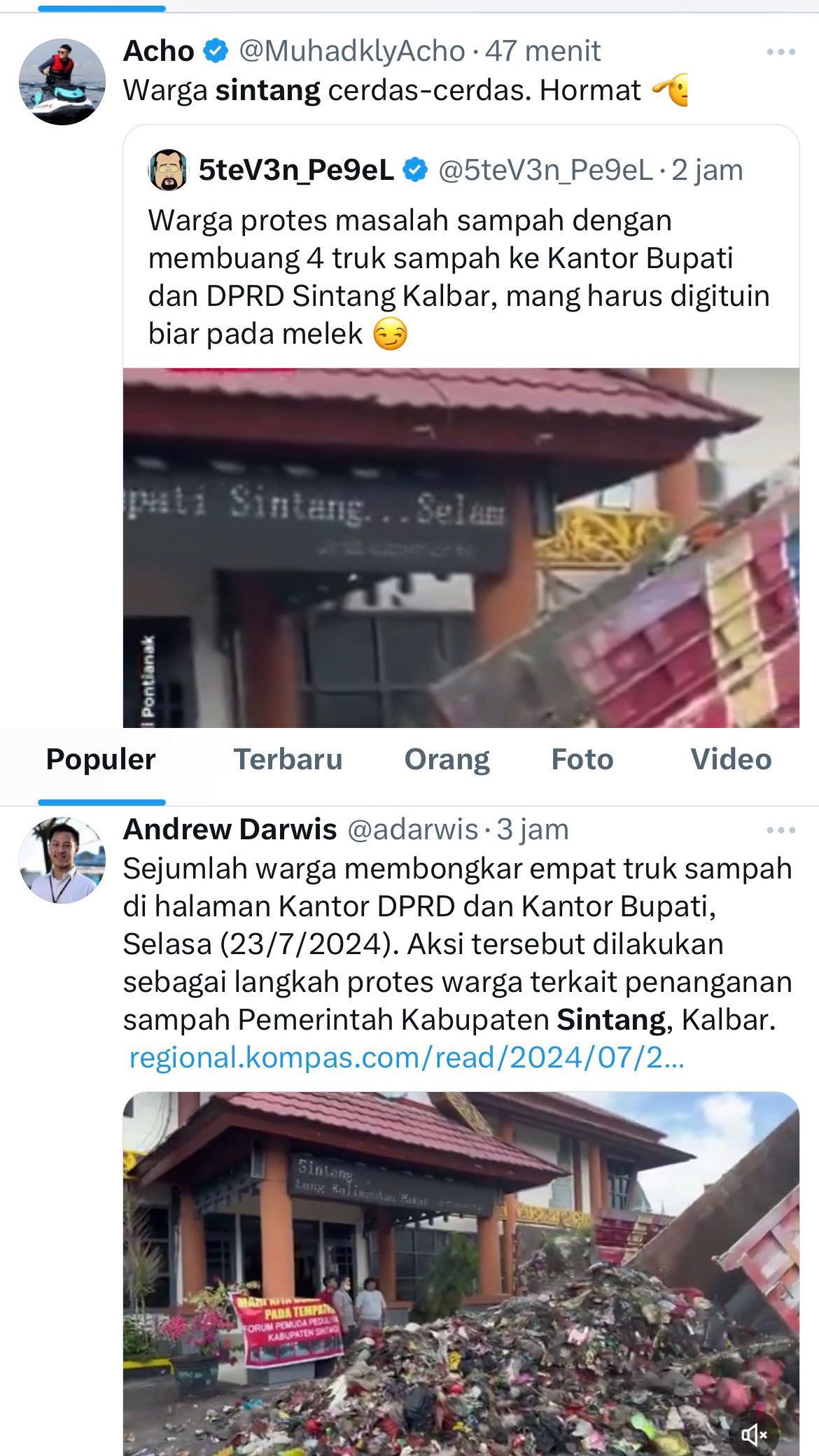 Tak hanya sutradra nasional, pendiri Kaskus Andrew Darwis juga membagikan tautan berita di X terkait aksi sejumlah warga membongkar empat truk sampah di halaman Kantor DPRD dan Kantor Bupati Sintang sebagai bentuk protes.