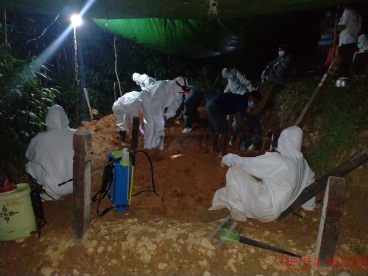 BERITA-AKTUAL.COM – Babinsa Koramil Sayan melaksanakan pengawalan dan pengamanan jalannya pemakaman jenazah yang terkonfirmasi corona di TPU Desa Siling Permai, Kecamatan Sayan, Kabupaten Melawi, Jumat malam.